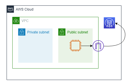さて、本題の「プライベートサブネット上にあるEC2インスタンスからメールを送信したいのだけど、どうすればいい?」なのですが、その前に「パブリックサブネット上にあるEC2インスタンスからメールを送信する」時の図を見てください。