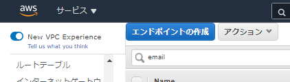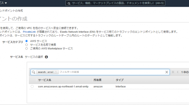 サービスカテゴリで「AWSサービス」を選択し、サービス名の中からSESを選択します。しかしSESで検索しても出てこないので、「email」で検索して、「com.amazonaws.ap-northeast-1.email-smtp」を選択しましょう。