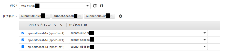 あとはVPCエンドポイントを設置するVPCとサブネットを選択します。サブネットは複数指定可能ですが、1AZあたり1つのサブネットしか指定できないので注意してください。(余談ですが、「同じAZの複数のプライベートサブネットからメールを送信したいけど、サブネット間の通信は許可していないんです!」という場合は、VCPエンドポイントを複数作成すれば、同じAZの中に複数のVPCエンドポイントできます。)以下はAZ-A、AZ-C、AZ-DのそれぞれにVPCエンドポイントを設置する例です。