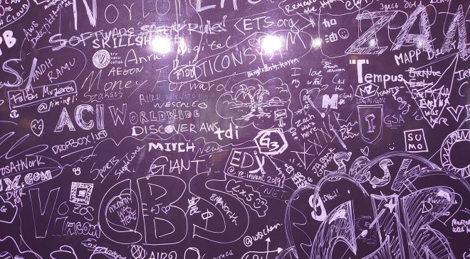 re:Inventのお決まりで壁一面の巨大な黒板に、参加者が自社の名前や、製品の名前を書いていきます。tdiの名前を書き込むことができました。