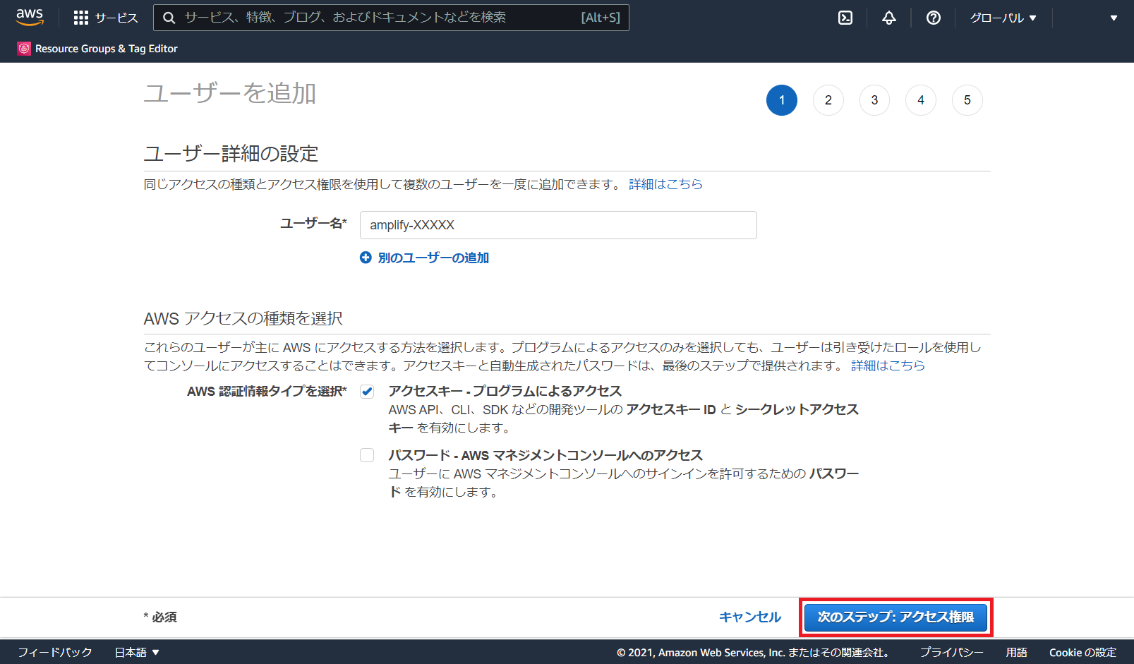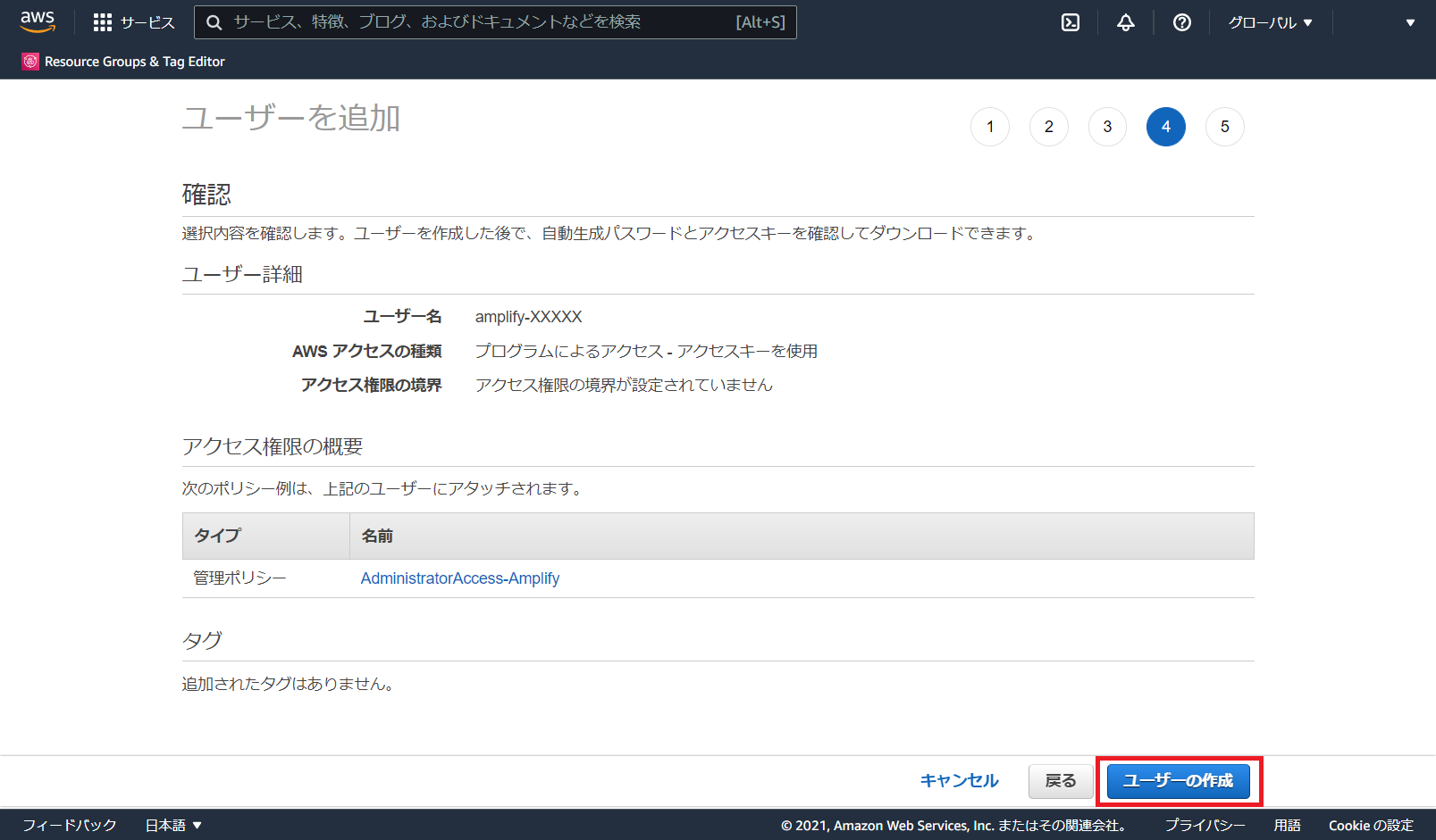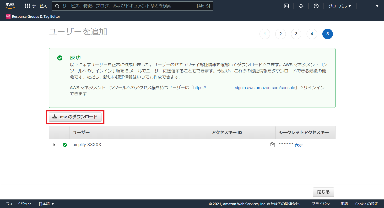 Specify the AWS Region ? region: ap-northeast-1 Specify the username of the new IAM user: ? user name: (amplify-XXXXX) Complete the user creation using the AWS console https://console.aws.amazon.com/iam/home?region=ap-northeast-1#/users$new?step=final&accessKey&userNames=amplify-XXXXX&permissionType=policies&policies=arn:aws:iam::aws:policy%2FAdministratorAccess Press Enter to continue |