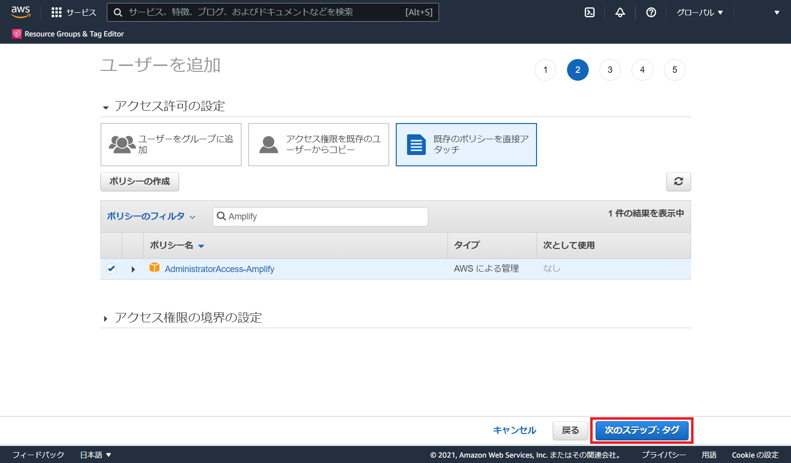 「AdministratorAccess-Amplify」にチェックを入れ、「次のステップ:タグ」ボタンをクリックします。「AdministratorAccess」にチェックが入っていたら外しましょう。