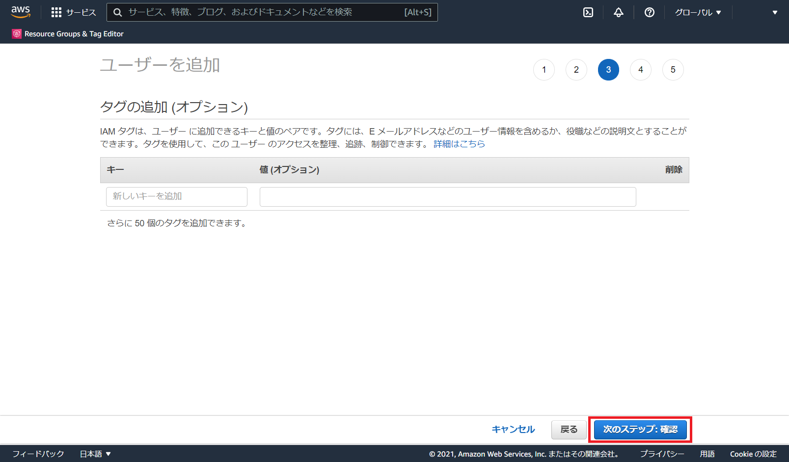 必要であればタグを入力し、「次のステップ:確認」ボタンをクリックします。