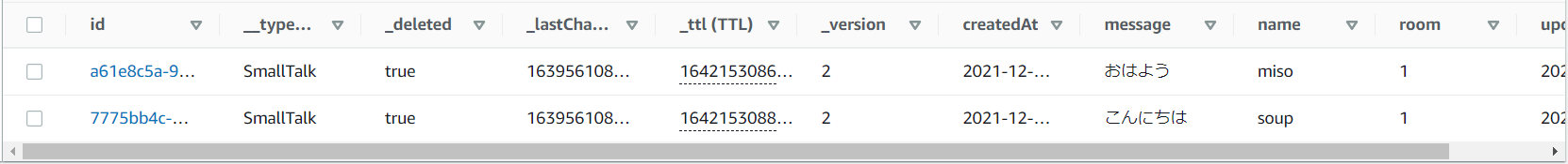 DymamoDBのほうも見てみると_deletedという属性が「true」になっているのが確認できます。物理削除ではなく論理削除なんですね。ちなみにAmplify Studioで確認してみたところ、論理削除されたデータも表示されませんでした。
