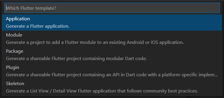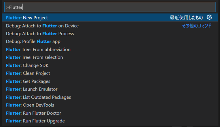 VSCodeを起動し、Ctrl+Shift+Pでコマンドパレットを開き、「Flutter: New Project」から「Application」を選択します。