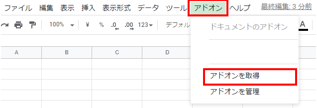 スプレッドシートを開き、「アドオン」→「アドオンを取得」をクリック。