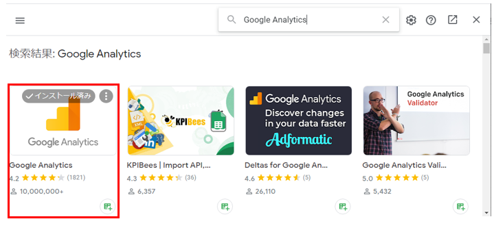 「Google Analytics」で検索し、公式のアドオンをクリック。