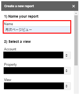 レポートの設定を以下の表を参考に入力し、「Create Report」をクリック。