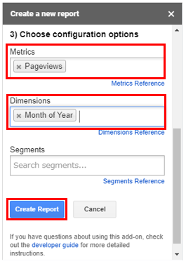 「アドオン」→「Google Analytics」→「Create new report」をクリック。