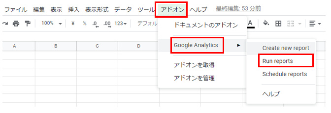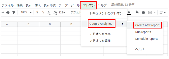 アドオンとは、追加の拡張機能のことを指します。Googleスプレッドシートにこのアドオンを追加することで、スプレッドシート上でアクセス解析レポートを自動作成できます。
