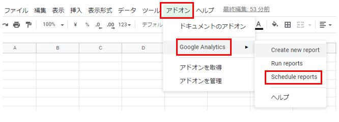 「アドオン」→「Google Analytics」→「Schedule reports」をクリック。