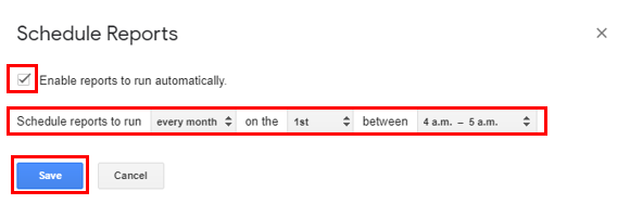 「Enable reports to run automatically.」にチェックを入れ、集計したいタイミングを設定し、「Save」をクリック。