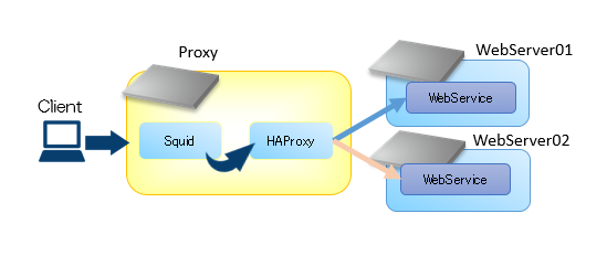 プロキシサーバでは、Squidをフォワードプロキシとして導入し、そこからリバースプロキシとしてのHAProxyに連携し、WebServerへとリダイレクトさせています。