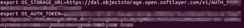 export OS_USER_ID=資格情報のuserId export OS_PASSWORD=資格情報のpassword export OS_PROJECT_ID=資格情報のprojectId export OS_AUTH_URL=https://identity.open.softlayer.com/v3 export OS_REGION_NAME=資格情報のregion export OS_IDENTITY_API_VERSION=3 export OS_AUTH_VERSION=3 swift auth |