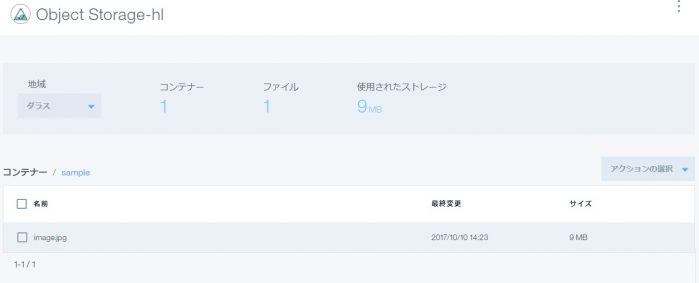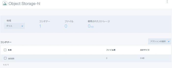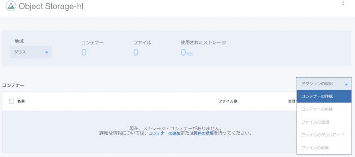 作成されたObject Storageサービスをクリックすると、選択している地域のコンテナー一覧が表示されます。
