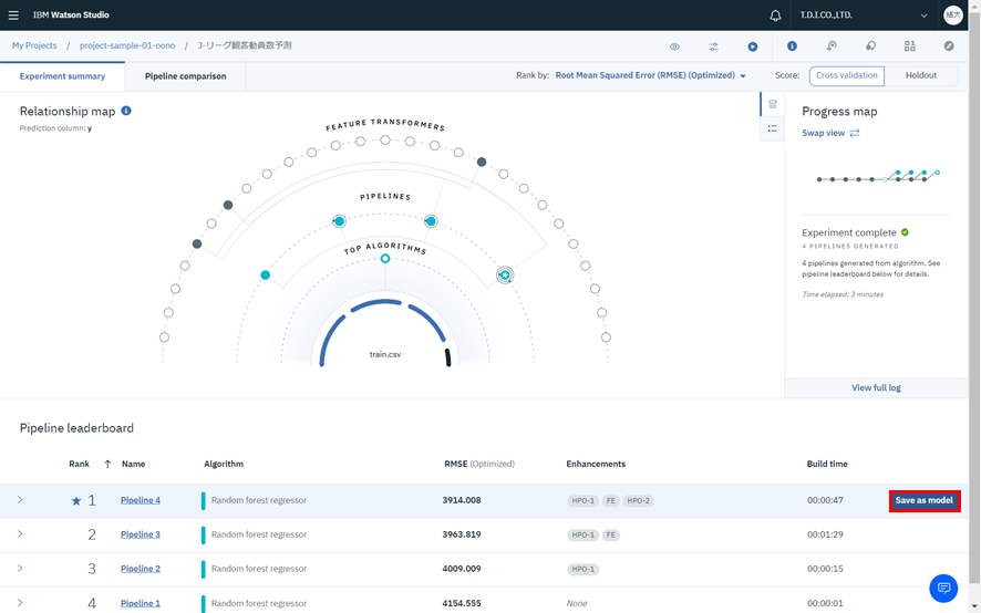 1. パイプライン4を選択すると「Save as model」が表示されるので、選択します。