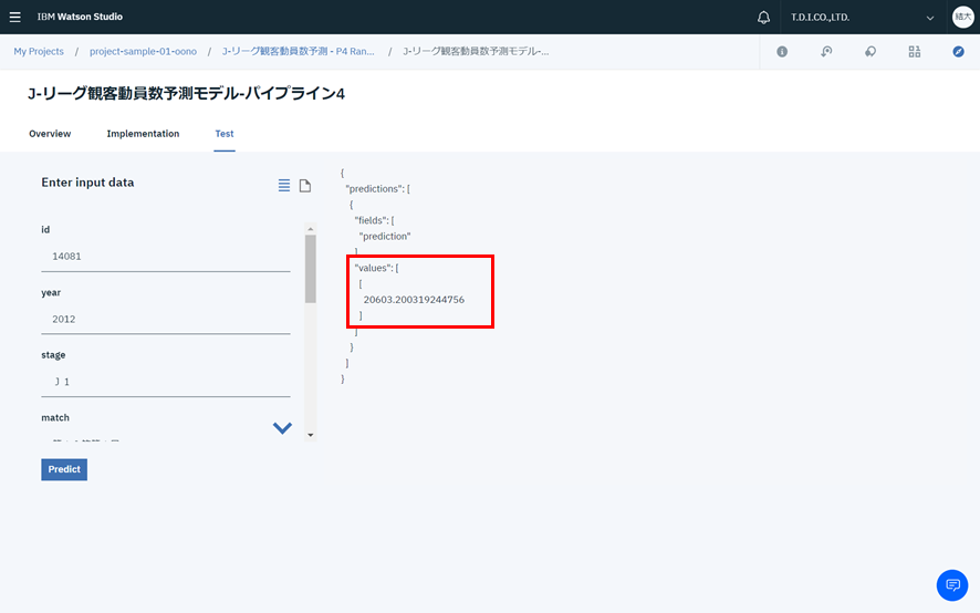 7. デプロイしたモデルを選択し、Testタブを開くとカラムの内容を入力すると予測モデルの観客数の予測を確かめることができます。