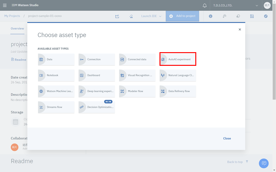1.  作成したPJから右上の「Add to project」を選択し、アセットタイプとして、「AutoAI experiment」を選択します。
