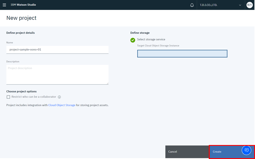 4.  プロジェクトの名前を入力し、使用するCloud Object Storageサービス・インスタンスを選択します。
