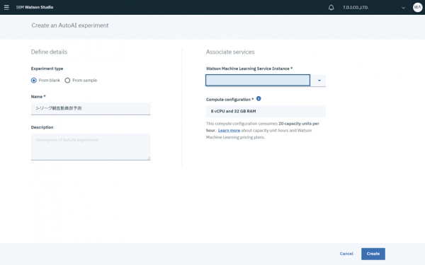 2. 「Create an AutoAI experiment (AutoAI エクスペリメントの作成)」ウィンドウで、以下の操作を行います。