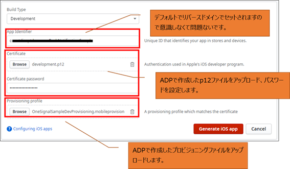 iOSは図15の通り、.p12ファイルとそのパスワードとプロビジョニングファイルを入力し、Generate iOS appを押下して、iOS用のネイティブアプリを生成します。