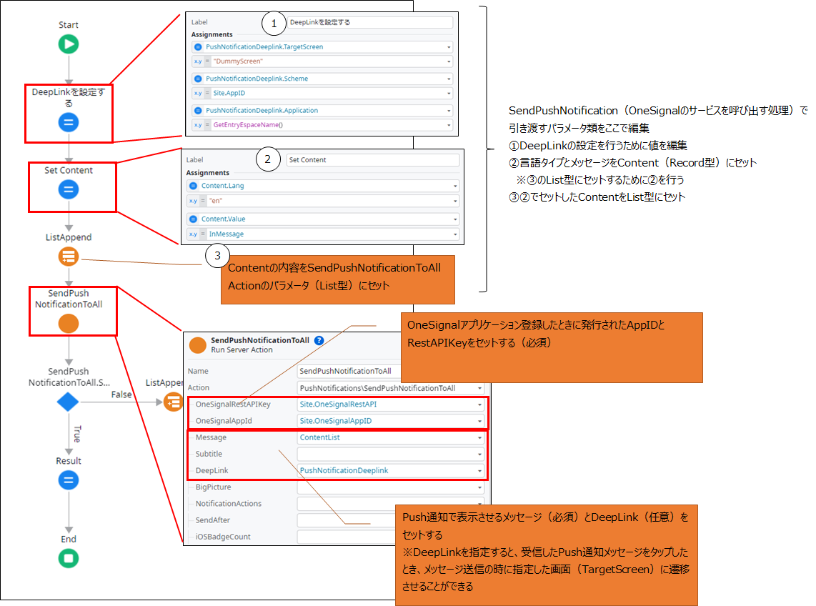 メッセージを送信する際に必要なものは、OneSignalを利用する際に必要な、AppIDとRestAPIKeyの2つです。本稿での実装方法において、AppIDとRestAPIKeyはサイトプロパティに保持しています。サイトプロパティは頻繁に変更されない値を持つグローバル変数として利用されており、AppIDとRestAPIKeyの値をサイトプロパティに保持しておくことで、その値が何かしらの理由で変更された場合でもService Centerで修正することができますので、アプリをPublishする必要がなくなります。