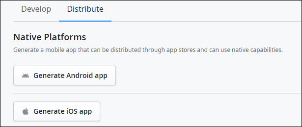 あらかじめ発行しておいた証明書やファイルを登録してネイティブアプリを生成していきます。OutSystemsのService Studioで、アプリのトップページにある、Distributeタブを選択するとネイティブアプリを生成する画面が表示されます(図12、図13)。
