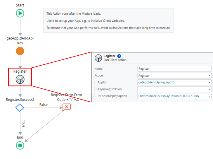 次にClient Actionを作成します。Push通知を受信するためにはOneSignalが管理するデータベースへ端末情報を登録する必要があります。端末情報をOneSignalへ送る処理はForgeのRegisterで実行されますので、これをClient ActionのOnApplicationReadyで実行するように設定します。OnApplicationReadyは通常デフォルトでは定義されないので、LogicタブのClient Actionで右クリック→Add System Event を選択することで定義することができます。RegisterにはAppIDをセットします。ロジックは図11のようになります。