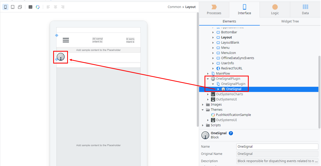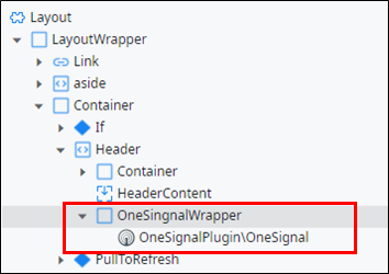 まず、Forge:OneSignalPluginのUI FlowからOneSignal、Clienet ActionからRegisterを選択しアプリで利用できるようにします。次にアプリケーションを起動したときに、OneSignalがロードされるよう設定を行います。InterfaceタブのUI Flows > Common > Layoutを開きます。そこに先ほど設定したOneSignalPlugin > UI Flow > OneSignalを配置します。このとき、コンテナを作成してOneSignal Wrapper等と名前を付けて配置をすると構造がわかりやすくなります。配置のイメージは図9のようになります。