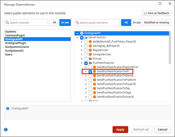 Management Dependenciesで、あらかじめダウンロードしたForge:OneSignalPluginのモジュールOneSignalAPIからSendPushNotificationToAllを選択し、アプリケーションで利用できるようにします。