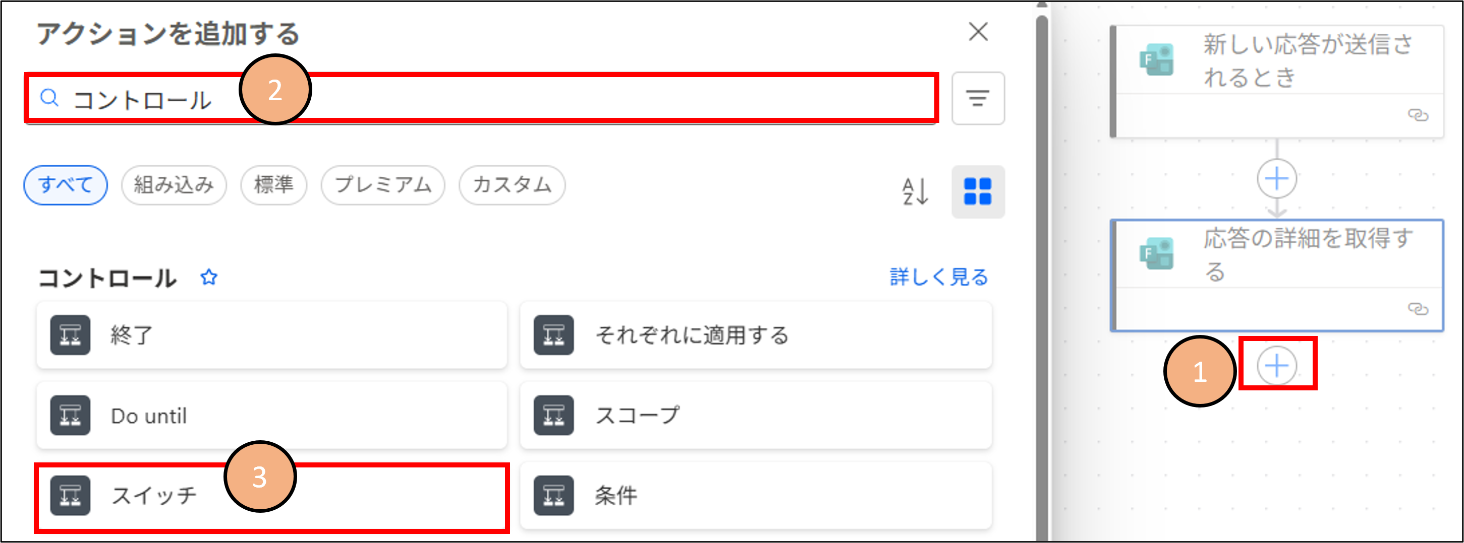 ①「応答の詳細を取得する」アクション下の「+」をクリックします。