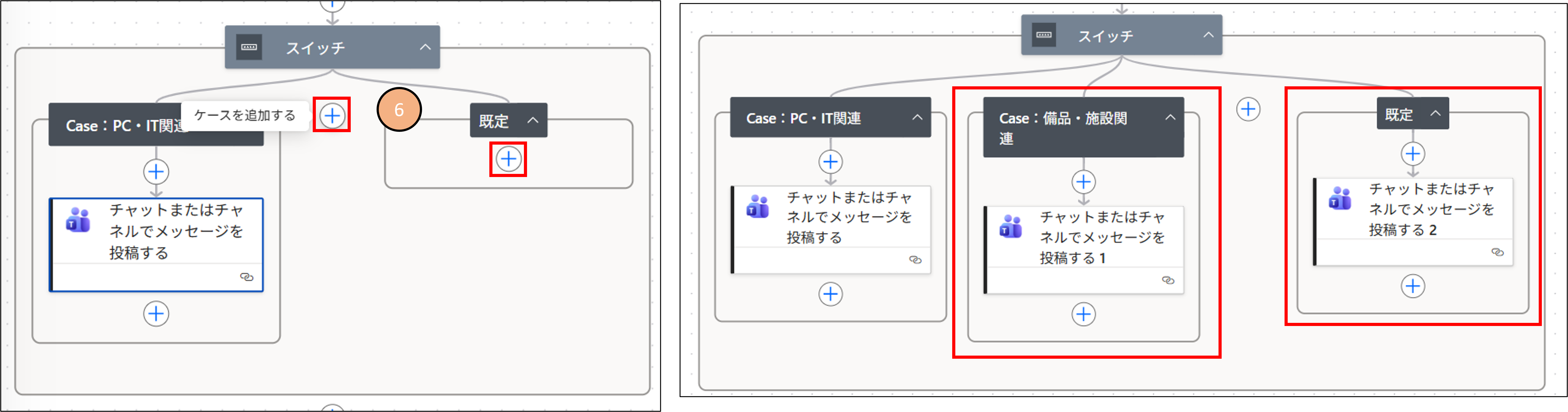 「スイッチ」アクション内にある「+」(ケースを追加する)アイコンをクリックし、他の分岐「Case 2 (「備品・施設関連」が選択された場合)」、「既定(「その他」が選択された場合)」を追加します。