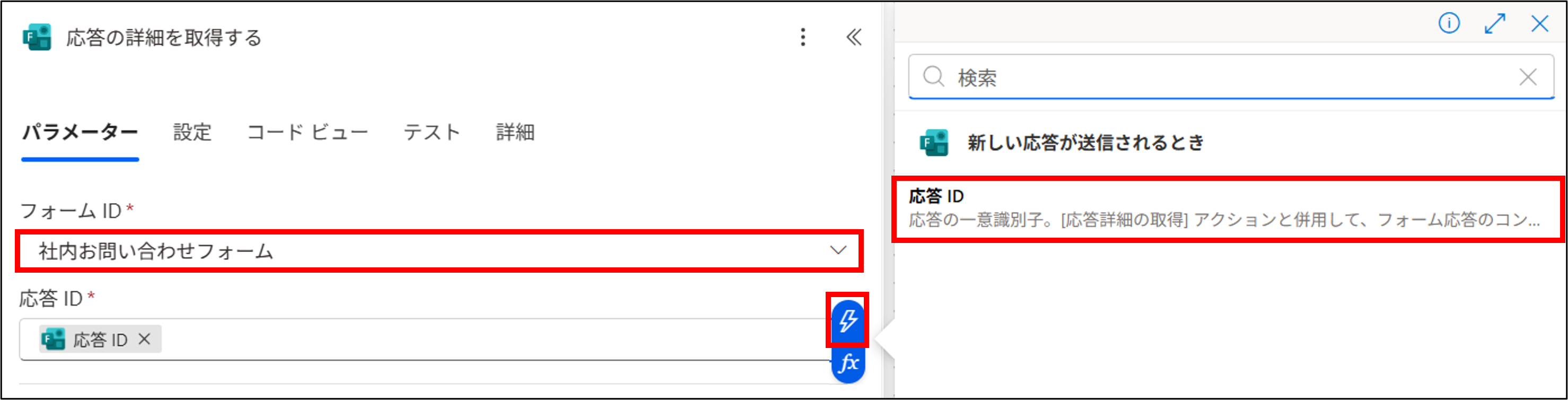 詳細:[入力欄横の稲妻アイコンをクリックし「応答の詳細を取得する」の「詳細内容」を選択]