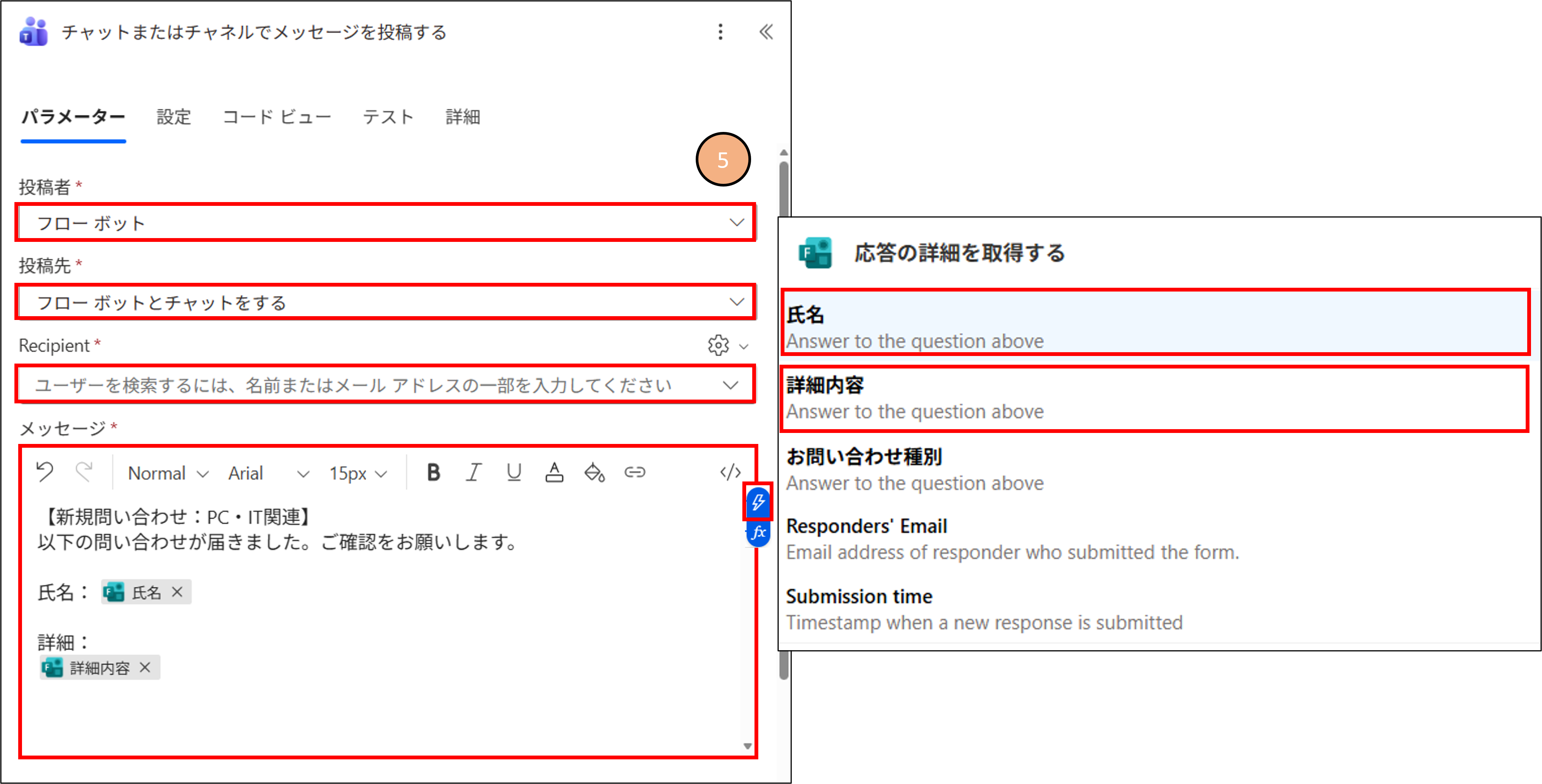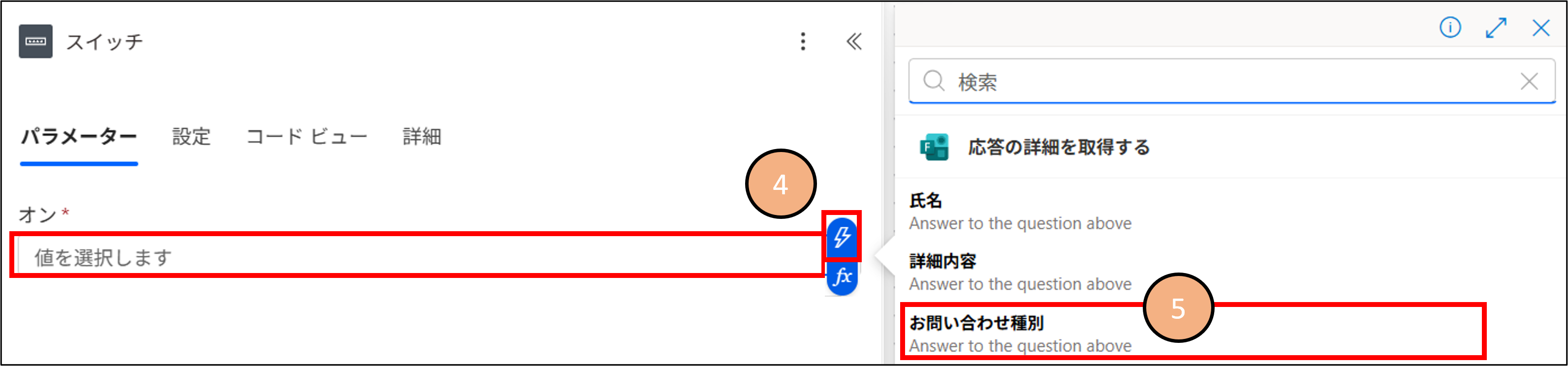 ⑤「動的なコンテンツ」から、「応答の詳細を取得する」の「お問い合わせ種別」(Microsoft Formsの質問2のタイトル)を選択します。