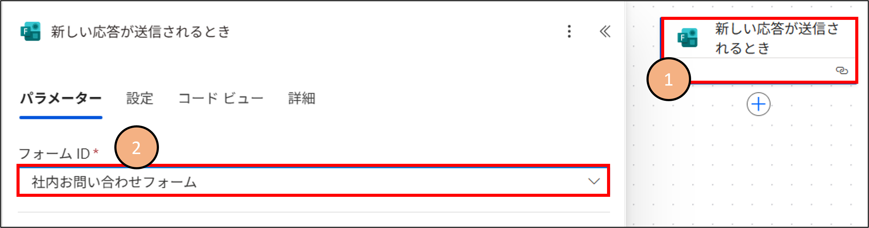 ①作成された「新しい応答が送信されるとき」トリガーをクリックします。