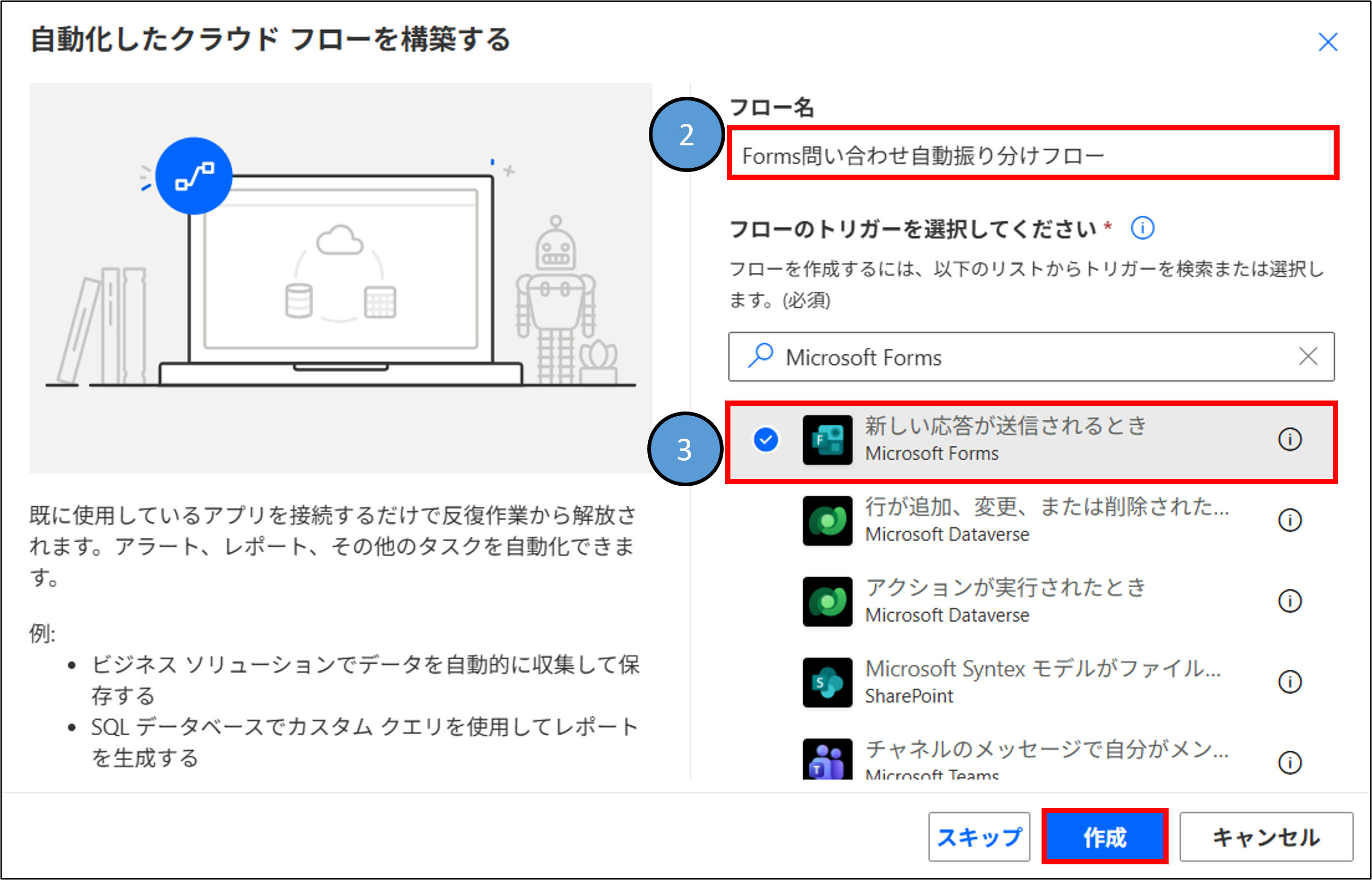 ②フロー名を「Forms問い合わせ自動振り分けフロー」と入力します。