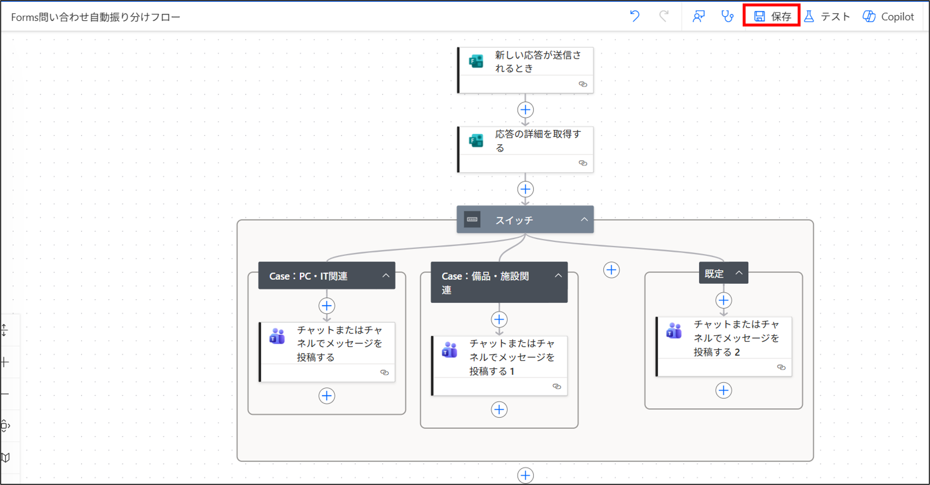 以上でフローの作成が完了です。実際にMicrosoft Formsの「社内お問い合わせフォーム」から「PC・IT関連」や「備品・施設関連」を選んで送信し、それぞれの内容がMicrosoft Teamsの宛先に正しく通知されるか確認してみてください。
