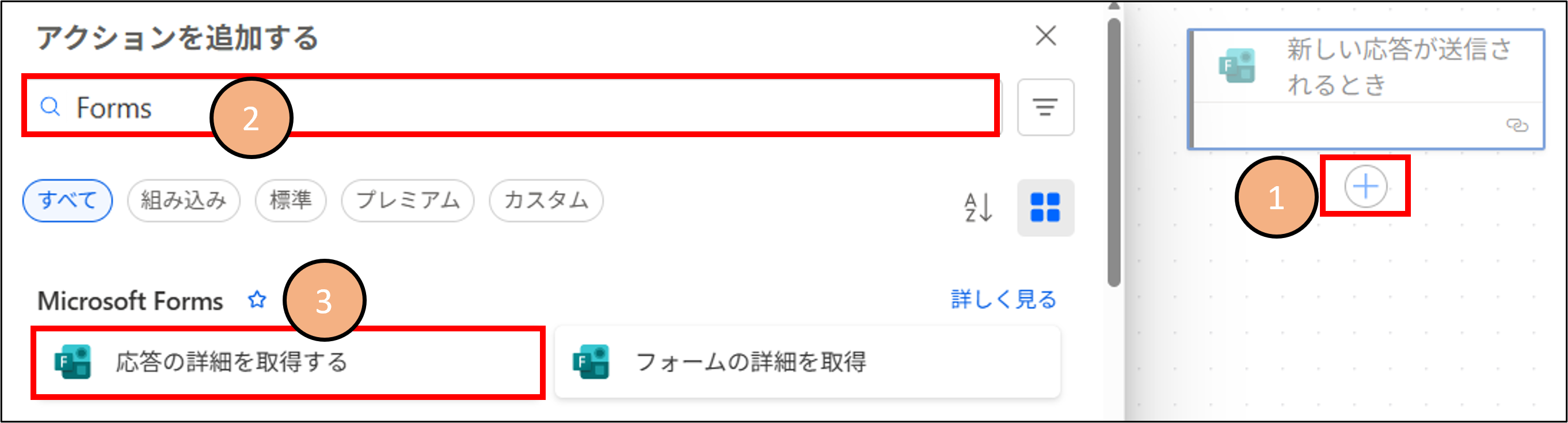 ③表示されたMicrosoft Formsのアクション:「応答の詳細を取得する」を選択します。(表示されない場合は「詳しく見る」から選択できます。)