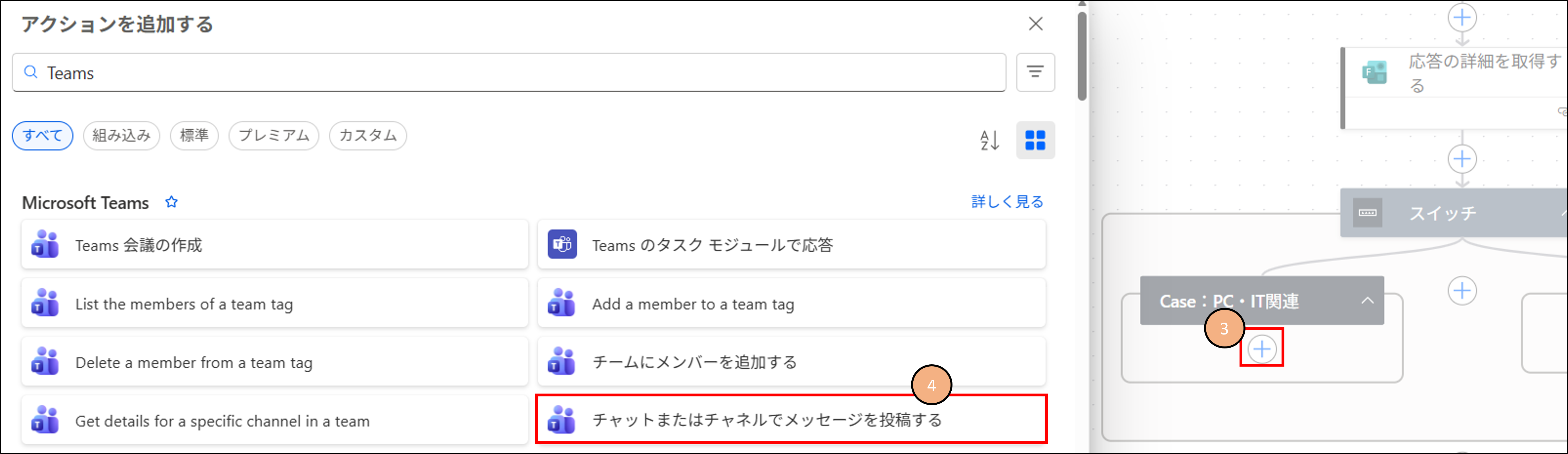 ④検索ボックスに「Teams」と入力し、「チャットまたはチャネルでメッセージを投稿する」アクションを選択します。(表示されない場合は「詳しく見る」から選択できます。)