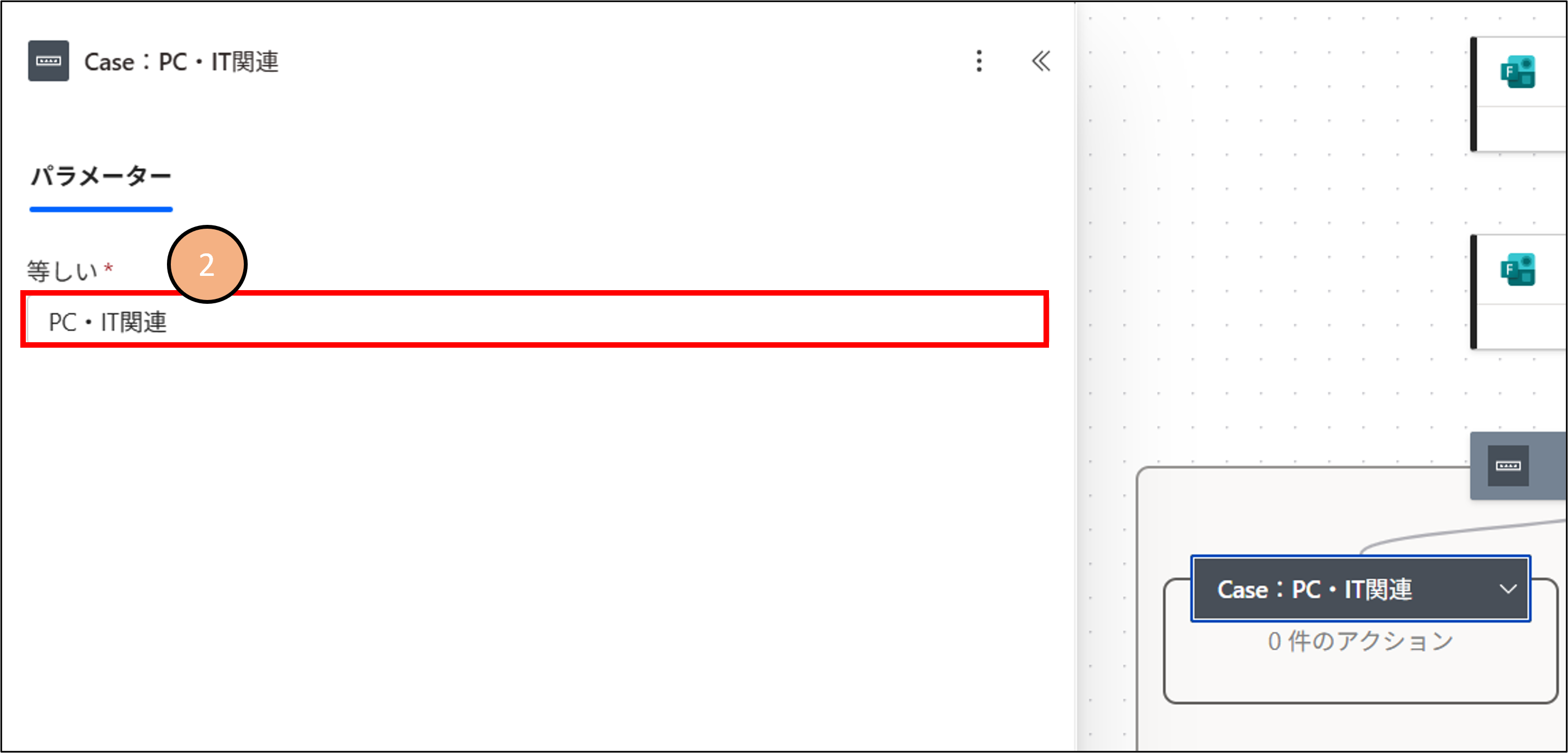 ②「等しい」入力欄にMicrosoft Formsの質問2「お問い合わせ種別」の選択肢(例: PC・IT関連)を入力します。