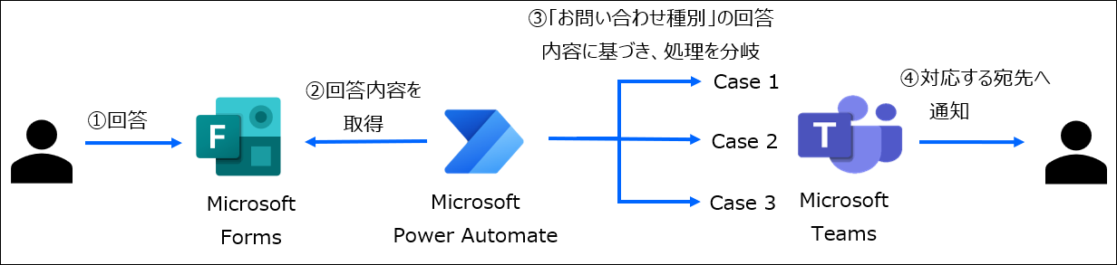今回作成するフローは、Microsoft Formsで送信された「社内お問い合わせフォーム」の回答をトリガーに設定します。 処理の流れは以下の通りです。