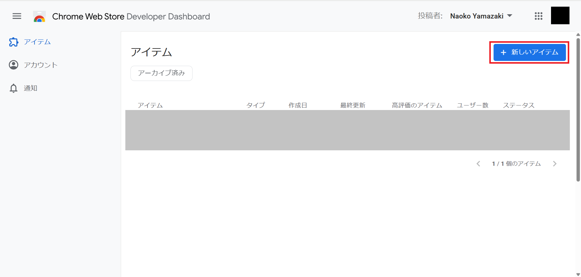 画面右上の「新しいアイテム」ボタンをクリックし、作成した拡張機能アプリ(をzipファイルに圧縮したもの)をアップロードします。