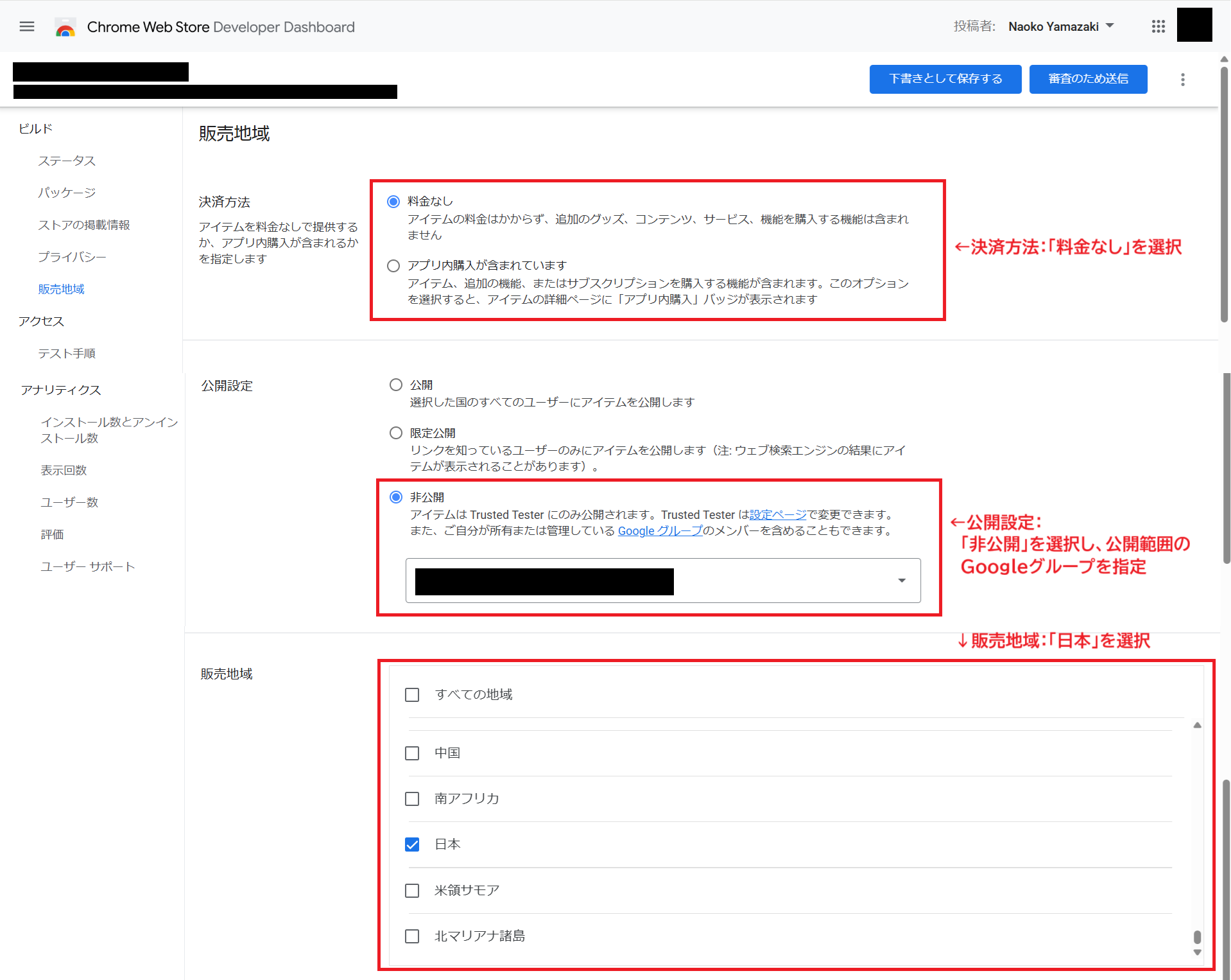 - 販売地域 →「日本」を選択する