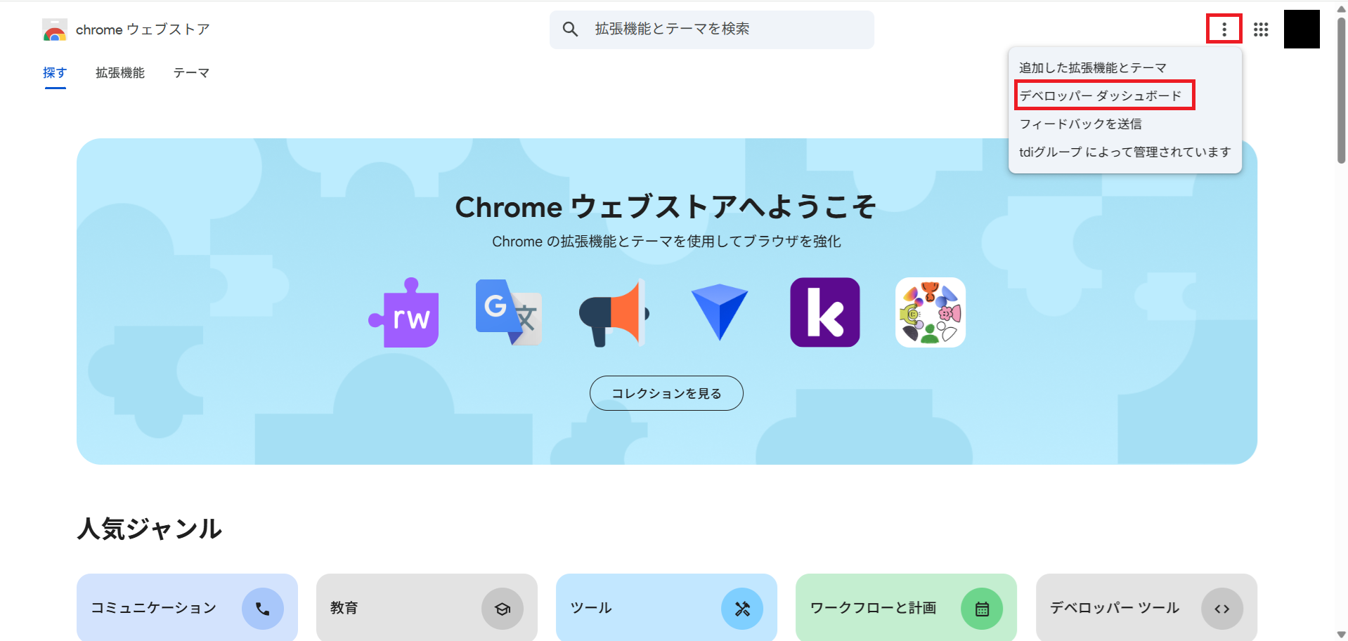 Chromeウェブストア(Googleで「Chromeウェブストア」と検索して辿り着けます)にアクセスし、画面右上の三点リーダーから「デベロッパー ダッシュボード」をクリックします。