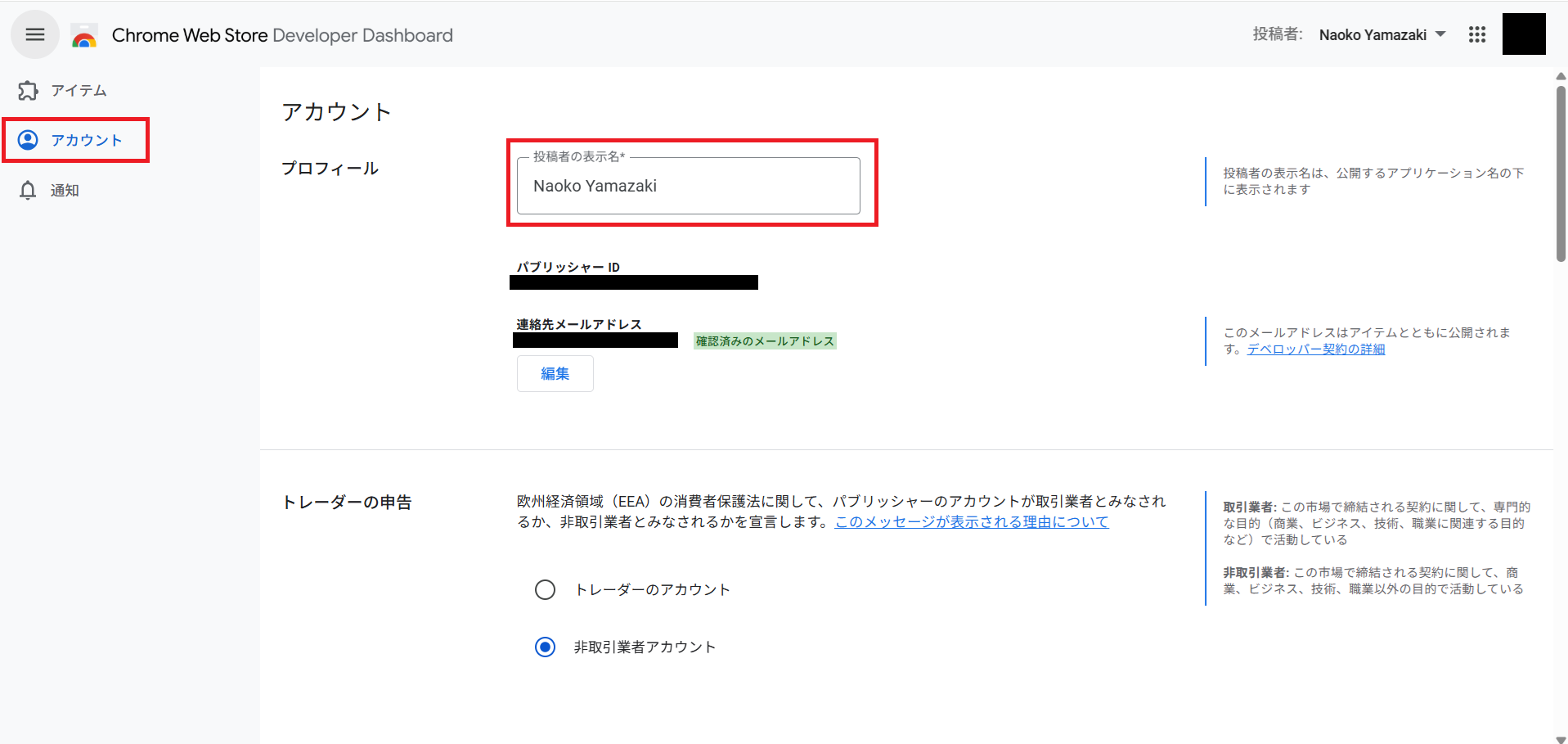 - デベロッパーダッシュボード画面の「アカウント」から、「投稿者の表示名」を設定します