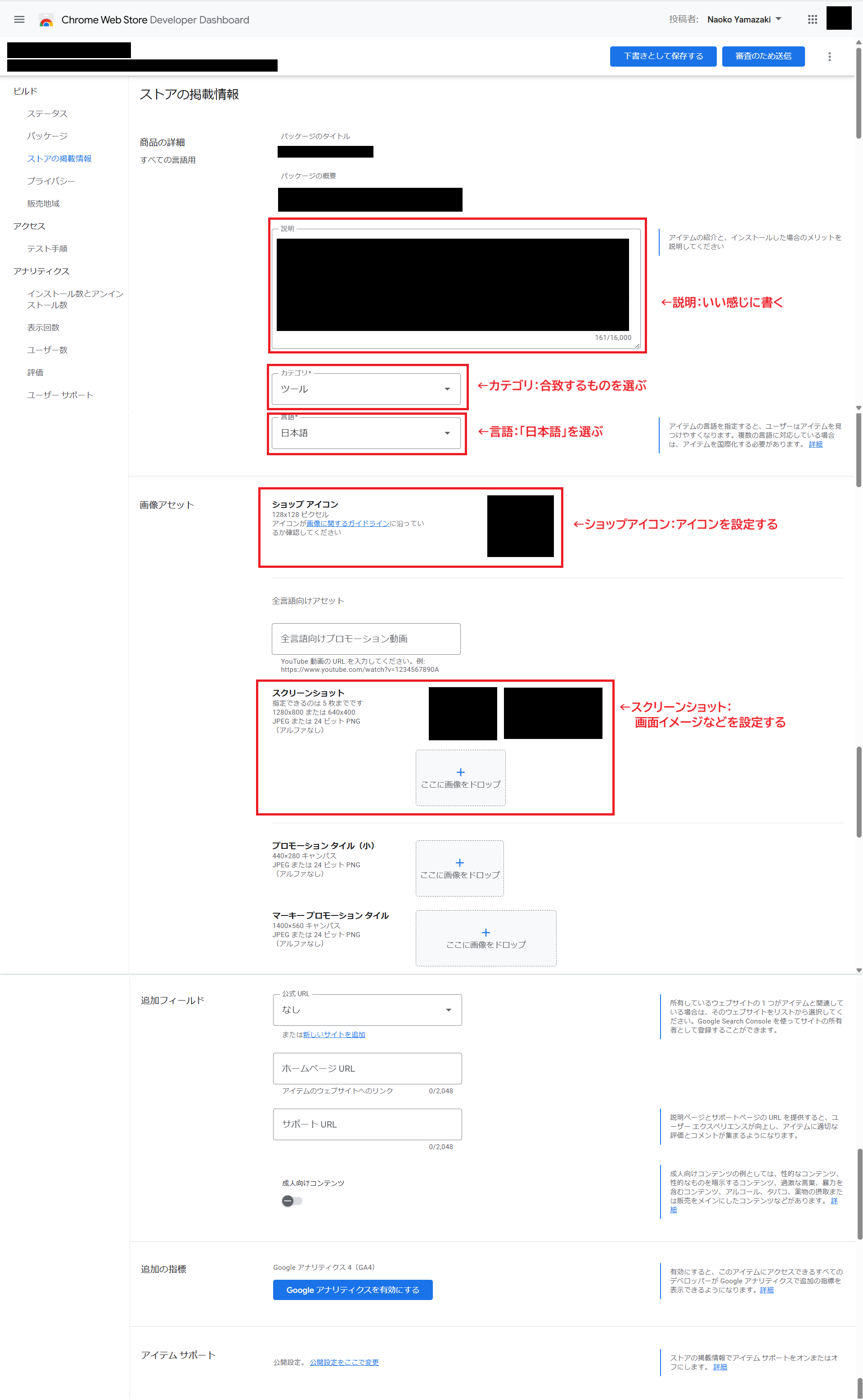 - 拡張機能のページで投稿者として表示される名前です