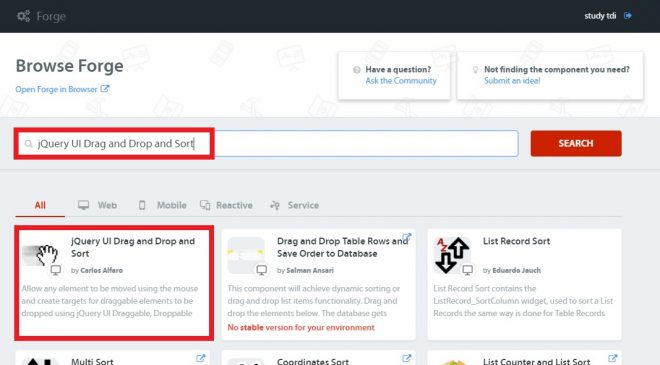 ServiceStudioのForgeから「jQuery UI Drag and Drop and Sort」を検索し、インストールをします。